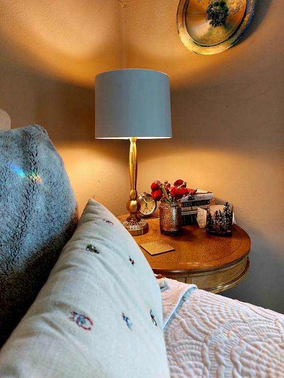 I was listening to my Right to Write course, by Julia Cameron, and she was talking about having writing stations. Different spaces throughout the house to sit and write, depending on the mood. I have those, but not only for writing. I have spaces that soothe me, and each one has a different feel. One of my favorite spaces is the middle of my bed. Sometimes, in the evening I sit there and write after a long day.