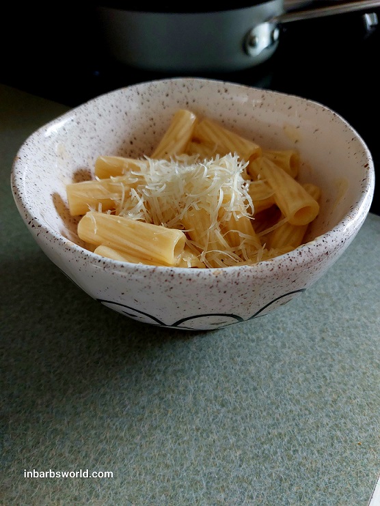 Cook the pasta until done to your liking and let drain in a strainer. While the pot, or pan is still hot, drop the butter in to melt and turn heat to low to add heavy cream along with cheese. Stir well and add cooked pasta stirring to combine thoroughly with cheese sauce. If you cook the recipe as listed here it will serve 2 people, but you can alter the serving to one on the recipe website. If there happens to be any leftover it’s delicious heated up the next day for a lite lunch!