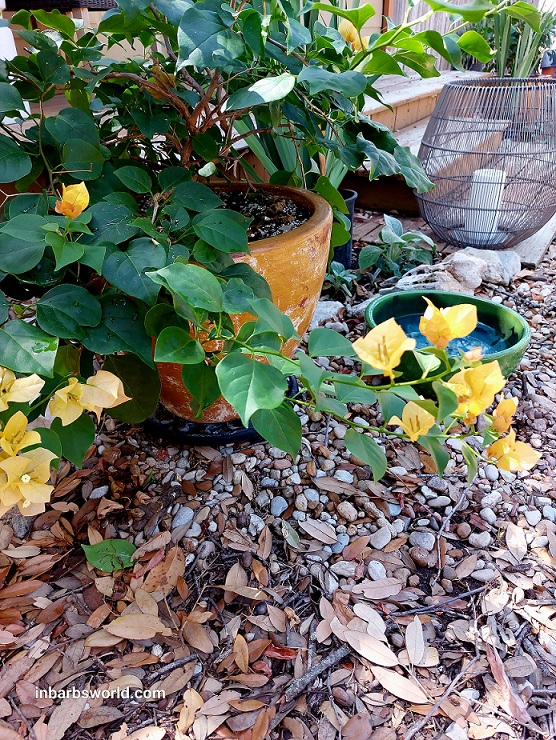 I always water the foliage of the plant after watering the pot it’s planted in and here’s one of my favorite things at the moment. The female Cardinal’s fly onto the plant, drink the water laying on the leaves and then flutter all over the foliage to take a bath. Even though there’s a perfectly good bird bath hanging from a tree, they’d rather use the plants. It’s interesting to watch them fly from plant to plant almost like it’s their morning ritual if I do mine.