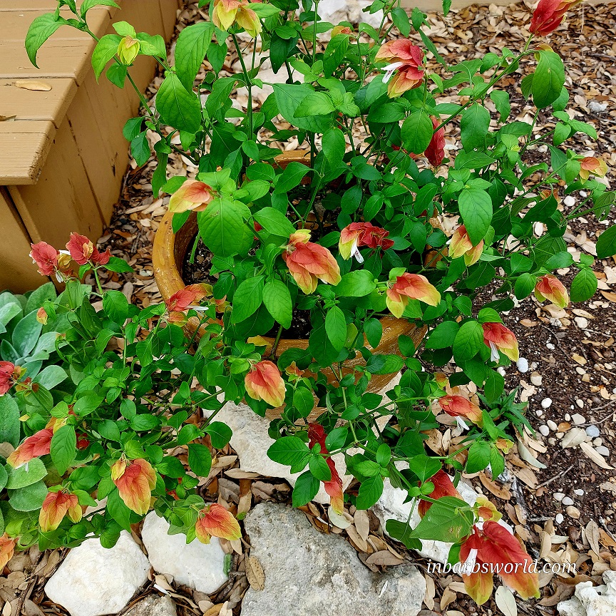 Each morning, I stand and gaze out the kitchen window waiting for the electric kettle to heat up. Sitting outside the window is a shrimp plant that was purchased one year ago and it’s one of my favorite plants. It’s also the plant that I was digging out of it’s planter in January to bring it inside for the winter. During the winter, I trimmed it back for it to rest, but sat it back outside about a month ago and it’s doubled in size. Here’s a photo I recently sent to a friend.