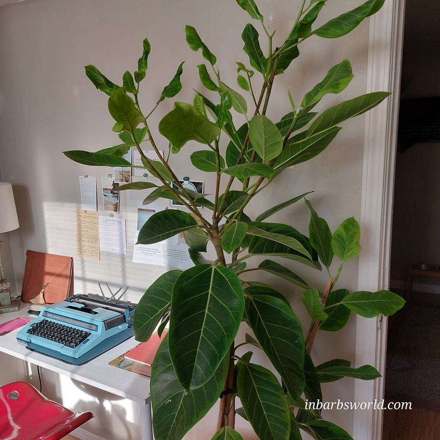 Getting out of bed I stepped into the room next door that used to be my daughter’s room, but is now my studio where Rumi has lived all summer. The room was filled with light and the tree had flourished there, adding at least another foot to it’s height since bringing it home. My room has light, but it’s filtered through the neighbors tree behind me, so it doesn’t compare to being bathed in light which is what you’ll find in the studio. I knew I had to move it back.