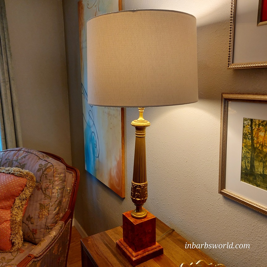 I asked the man working there, “Is it a 3-way?”, and he didn’t know. He advised turning the knob to see how many times it clicked, so I did and it felt like a 3-way. He didn’t realize I came prepared with a 3-way bulb to test it and once the bulb was installed, I turned the knob and that vintage lamp came to life! You can tell the lamp is old and outdated because they don’t make them like this anymore and the shade looks like a woven, tweed jacket from an era long ago. Another item full of stories.