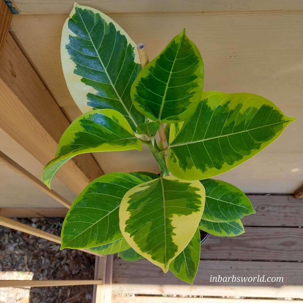 It grew roots and once the roots filled the jar, I planted it in proper soil. It was the funniest looking thing ever, just one, large leaf standing in a pot of dirt, but it grew as you can see here. This summer, I repotted it and sat it outside, just to see what it would do. Obviously, spending time outdoors is good for growth.