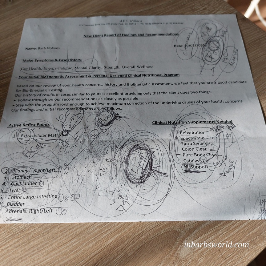 Dr. Jason whipped out a piece of paper containing my assessment results and started marking it up with a pen. Active Reflex Points: 1. Extracellular Matrix-Zero 2. Kidneys: Right & Left-Zero, 3. Stomach-Zero, 4. Gallbladder-Zero, 5. Liver-Zero, 6. Entire Large Intestine-Zero, 7. Bladder was low, 8. Adrenals: Right & Left-Zero!